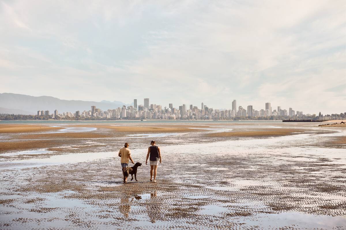 A couple and their dog walk along the Spanish Banks in Vancouver. 走出户外